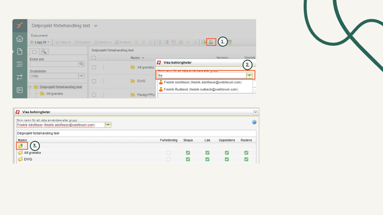2. Skriv in namn på den person och grupp du vill se behörighet för