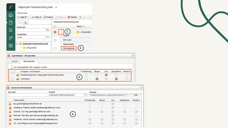 Vilka grupper som kan se behörigheter kan till viss del konfigureras per webbarbetsplats. Beskrivningen nedan kanske därför inte följer just ditt projekt. Vid frågor om behörighet kan du alltid kontakta din projektadministratör.
